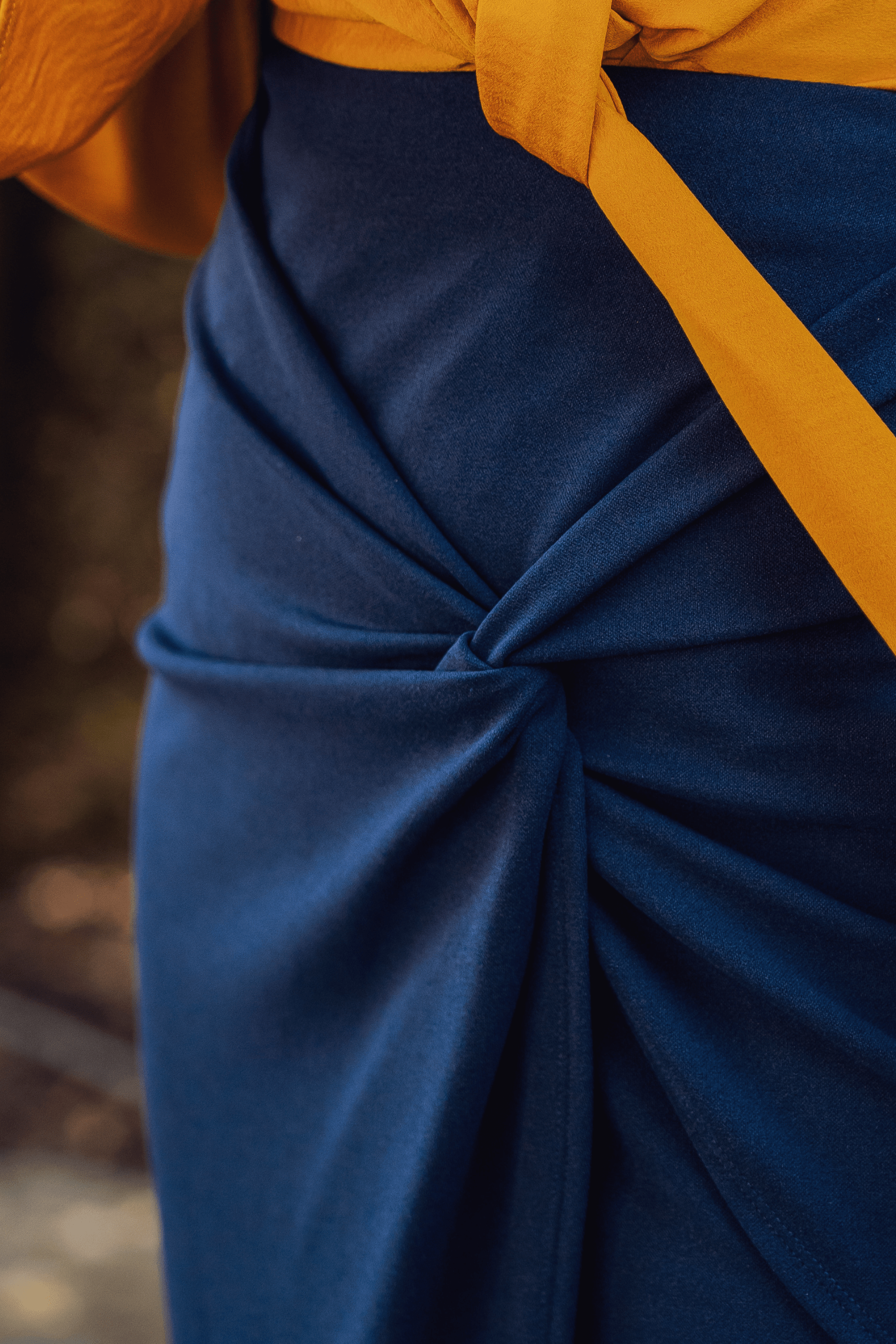 Front pleated, tight-fitting, solid Murano pencil skirt.